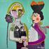 "State of Mind" is a storied and playfully sexy painting depicting a man with a bowl of fruit on his head, cigarette hanging from his mustache and offering a cocktail to a beautiful woman in an attempt to seduce her. His eyeball is gazing down at her breasts and her eyes tell the viewer exactly what she thinks of this guy. Against a strong background of turquoise, these figures reveal to the viewer their state of mind.